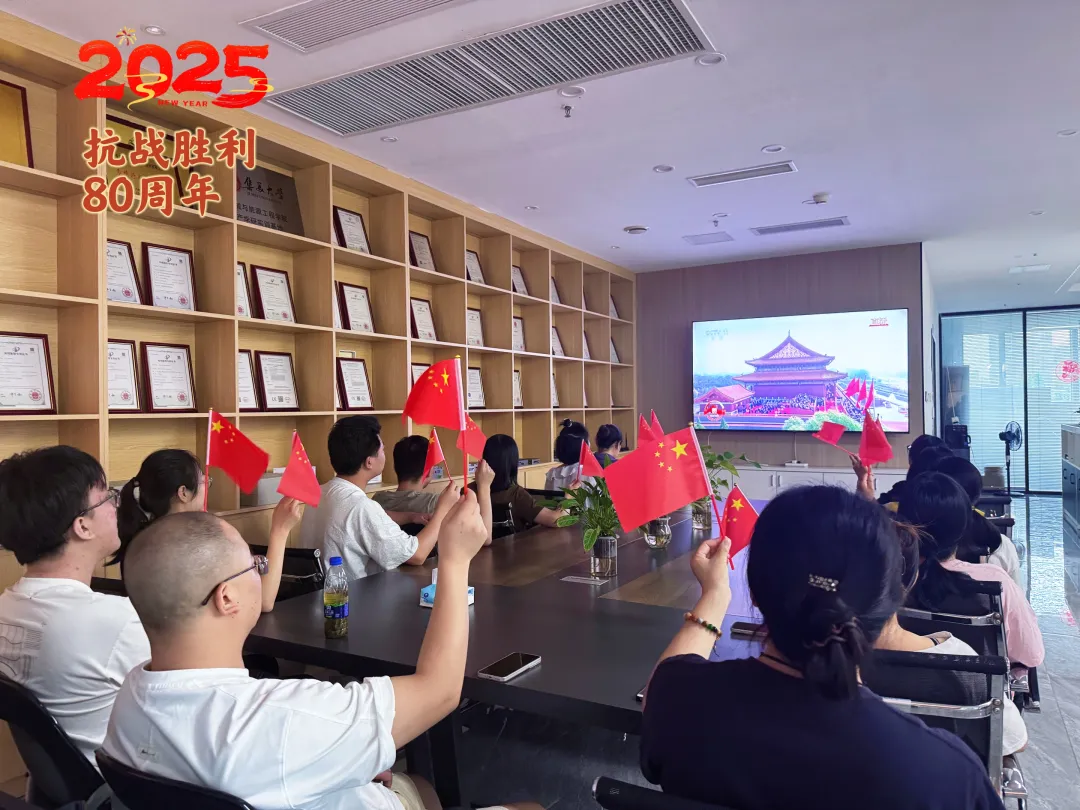 观看现场气氛庄严热烈,员工们手持五星红旗,全程专注收看阅兵盛况。仪式开始时,全体起立,目光凝视屏幕,高唱国歌,认真聆听习近平主席发表的重要讲话。